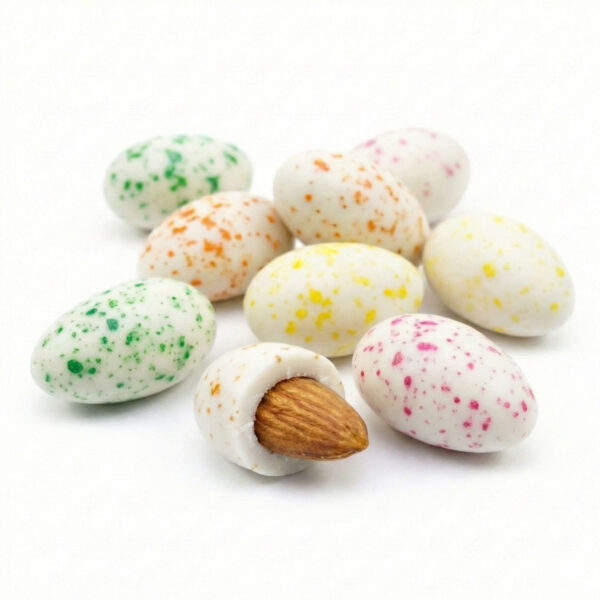 Ingredientes dos sabores: Morango com natas, ricota e pêra, pistácio, pêssego caramelizado – Interior: Chocolate branco 56%(açúcar, LEITE em pó integral, manteiga de cacau, emulsionante: lecitina de SOJA, aromas), Origem EU; AMÊNDOA torrada 17% Parte interna de sabor COCO NUT: chocolate branco (36%): (açúcar, LEITE em pó integral, emulsionante: lecitina de SOJA, aromas); chocolate com LEITE (20%): (açúcar, manteiga de cacau, LEITE em pó integral, pasta de cacau, emulsionante: lecitina de SOJA, aromas); AMÊNDOAS torradas (17%). Exterior: açúcar, amido de arroz, xarope de glicose, espessante: goma arábica, malto dextrina, agente de revestimento: cera de carnaúba. Corantes: E120, E101, E160a, E133, E155, E170.