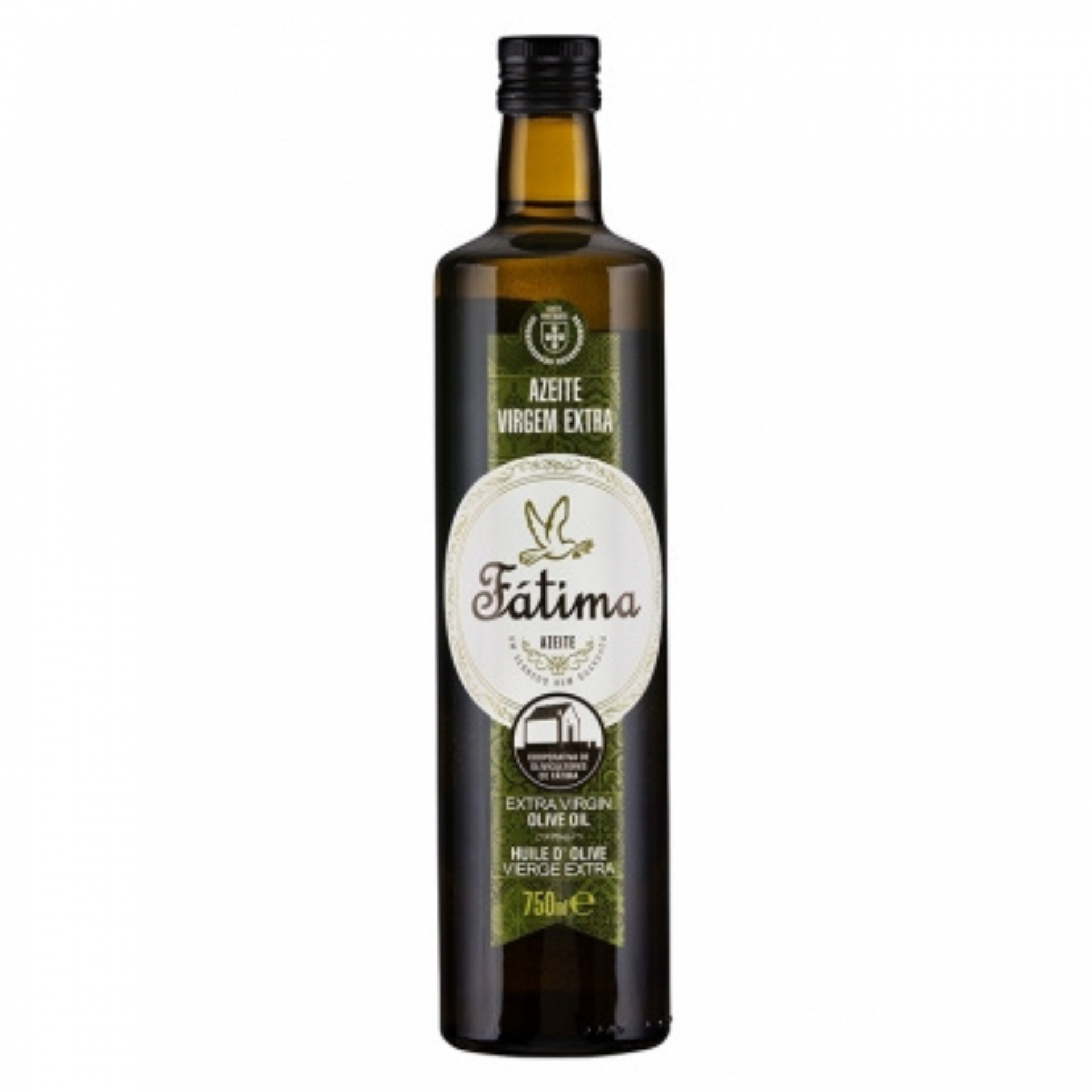 • Garrafa de azeite extra virgem Fátima em vidro castanho e rótulo verde e branco