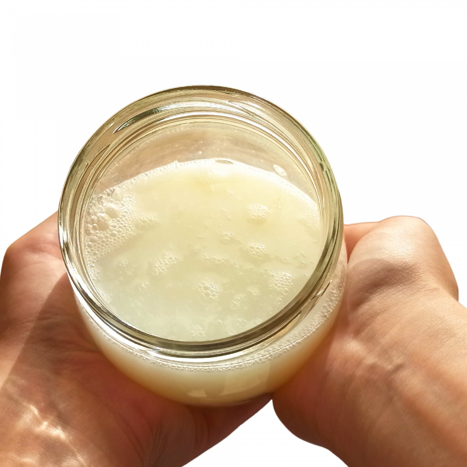 • Frasco de vidro com líquido branco espumoso nas mãos