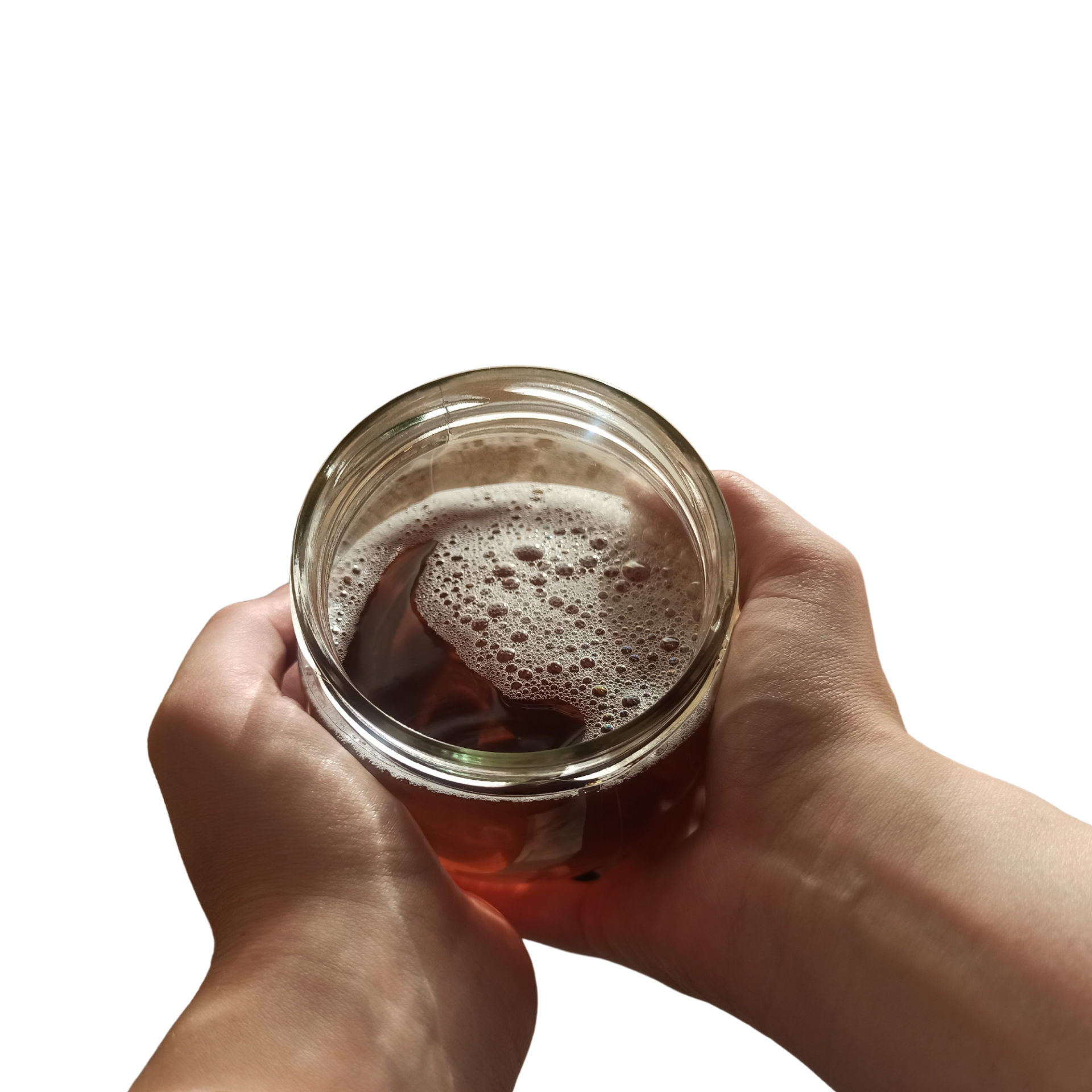 • Mãos a segurar frasco de vidro com líquido castanho com espuma