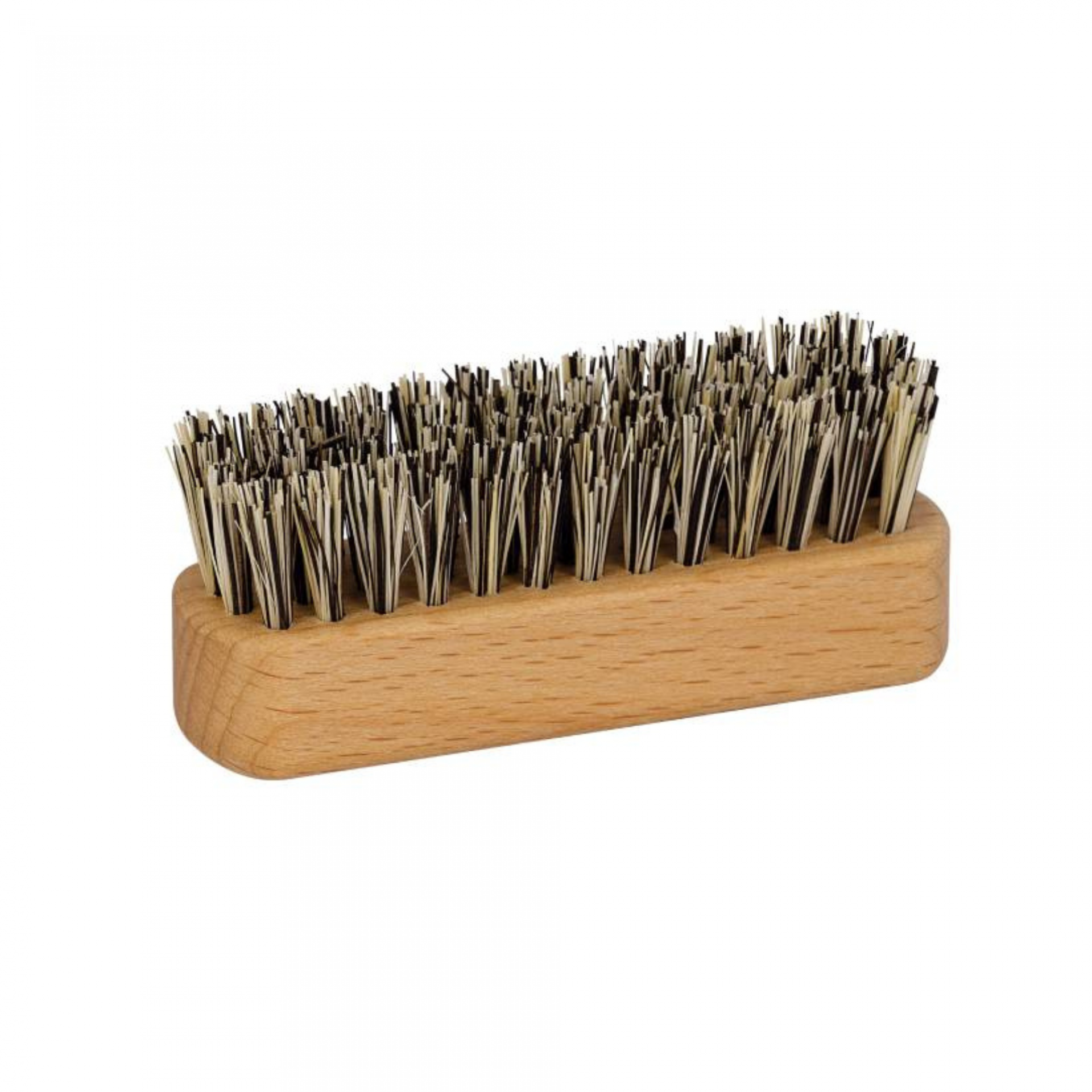 • Escova de limpeza com cabo em madeira clara e cerdas pretas e brancas
