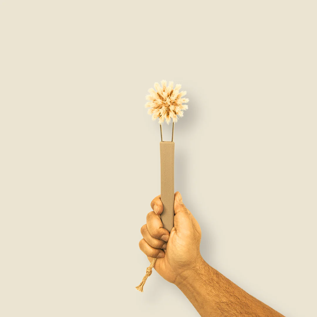 • Mão segurando escova de limpeza com cabo bege e cerdas claras