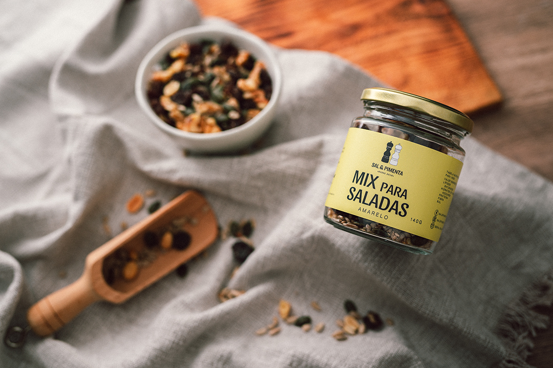 Mix para Saladas - Amarelo 140g - Sal & Pimenta 5,06 € 5,95 € Desconto de 15%. Partilhar Compre este produto e ganhe 10 Pontos! Saber mais Comprar Contactar SKU: 1152 Produto da Semana. Válido de 16 de Fevereiro de 2026 às 00:00 até 23 de Fevereiro de 2026 às 23:30. Ingredientes:Miolo de noz, sultanas, sementes de abóbora, sementes de girassol e sementes de sésamo branco. Conservar num lugar seco e fresco, sem luz solar. Alergénios:Noz e sementes de sésamo.Pode conter vertígios de amendoim ou de frutos de casca rija. Origem:Portugal Marca Sal & Pimenta Tags mixsaladassal & pimentanozsultanasvegansementes