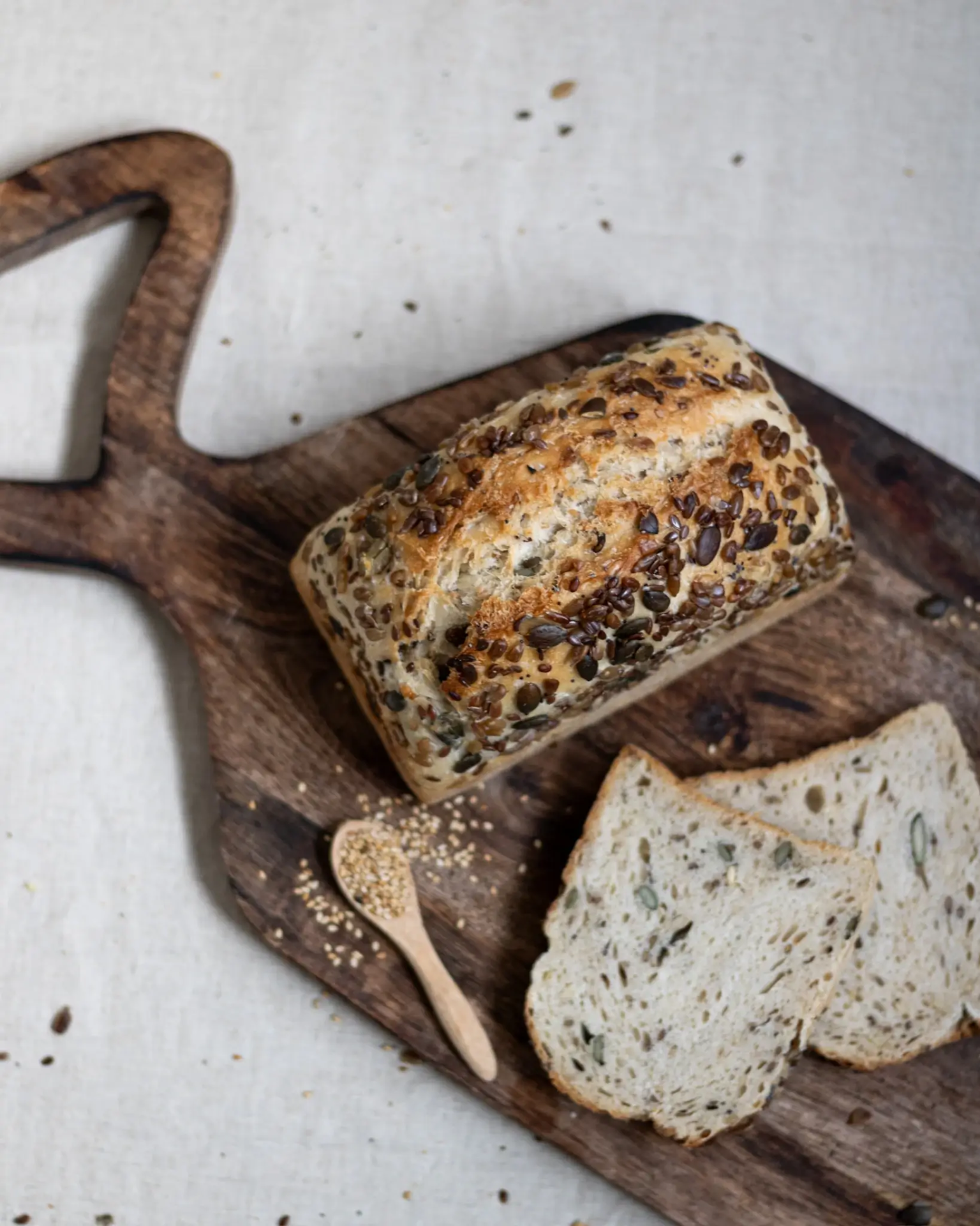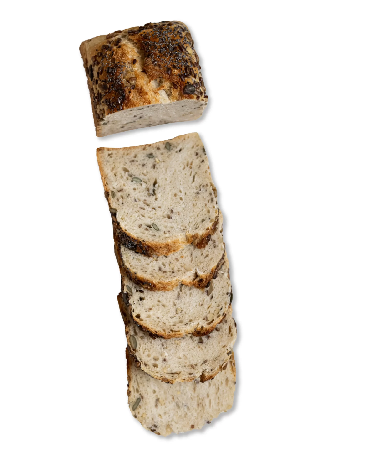 Da gama Massa Mãe ,Sem fermento , com base de Trigo e Espelta Orgânicos, ricamente coberto e recheado de Sementes de Abobora, Girassol, Linhaça e Papoila.