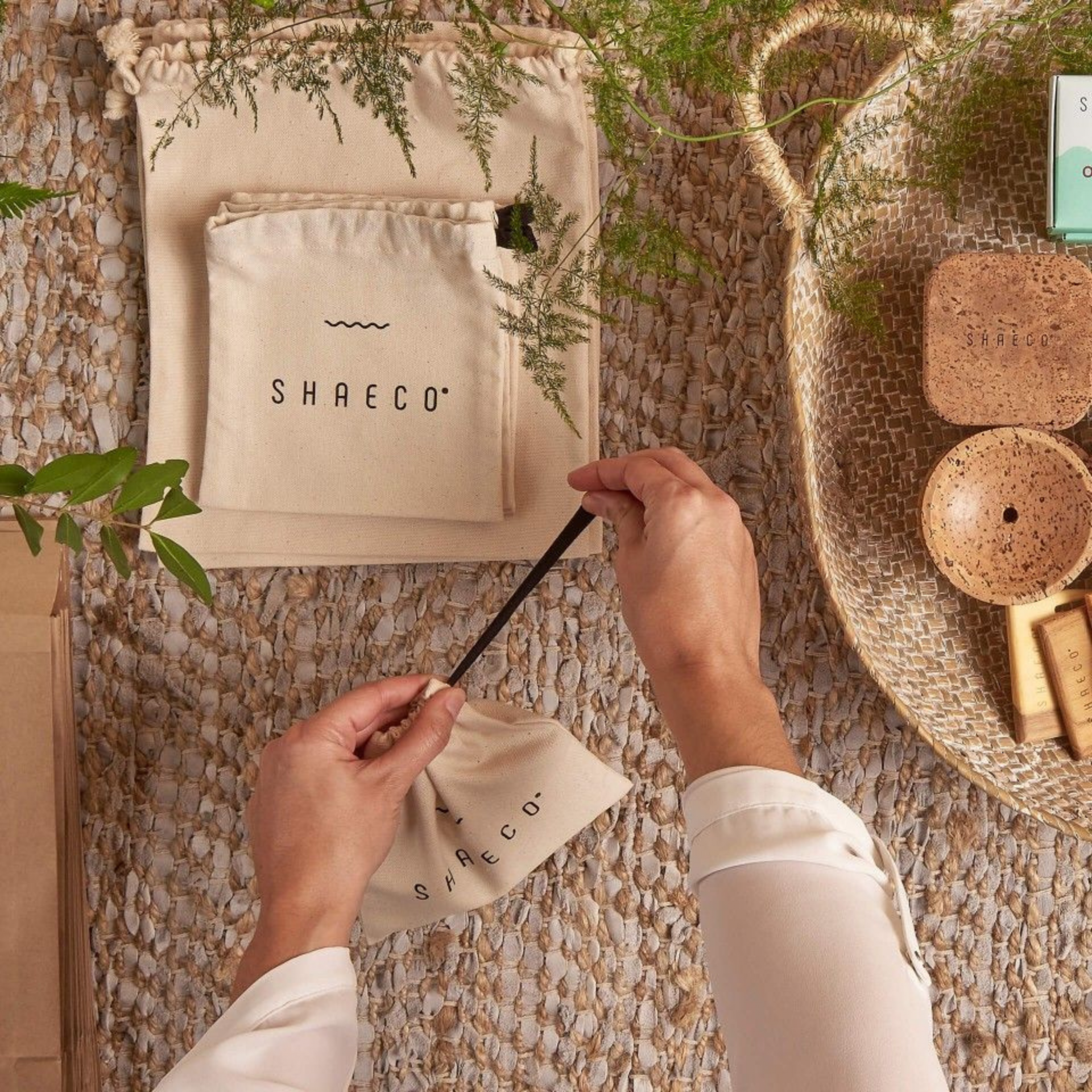 • Sacos de tecido cru com texto SHAEO e objetos de cortiça e ráfia numa superfície texturada.