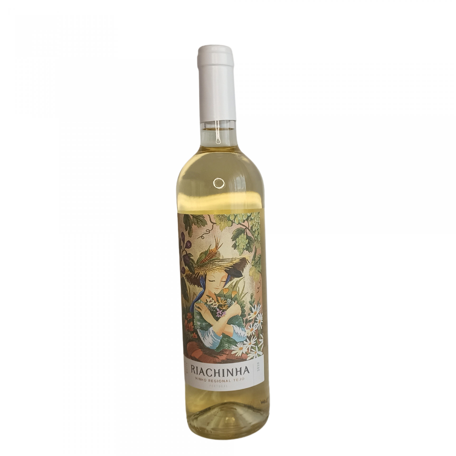 • Garrafa de vinho branco Riachinha com rótulo ilustrado e tampa branca